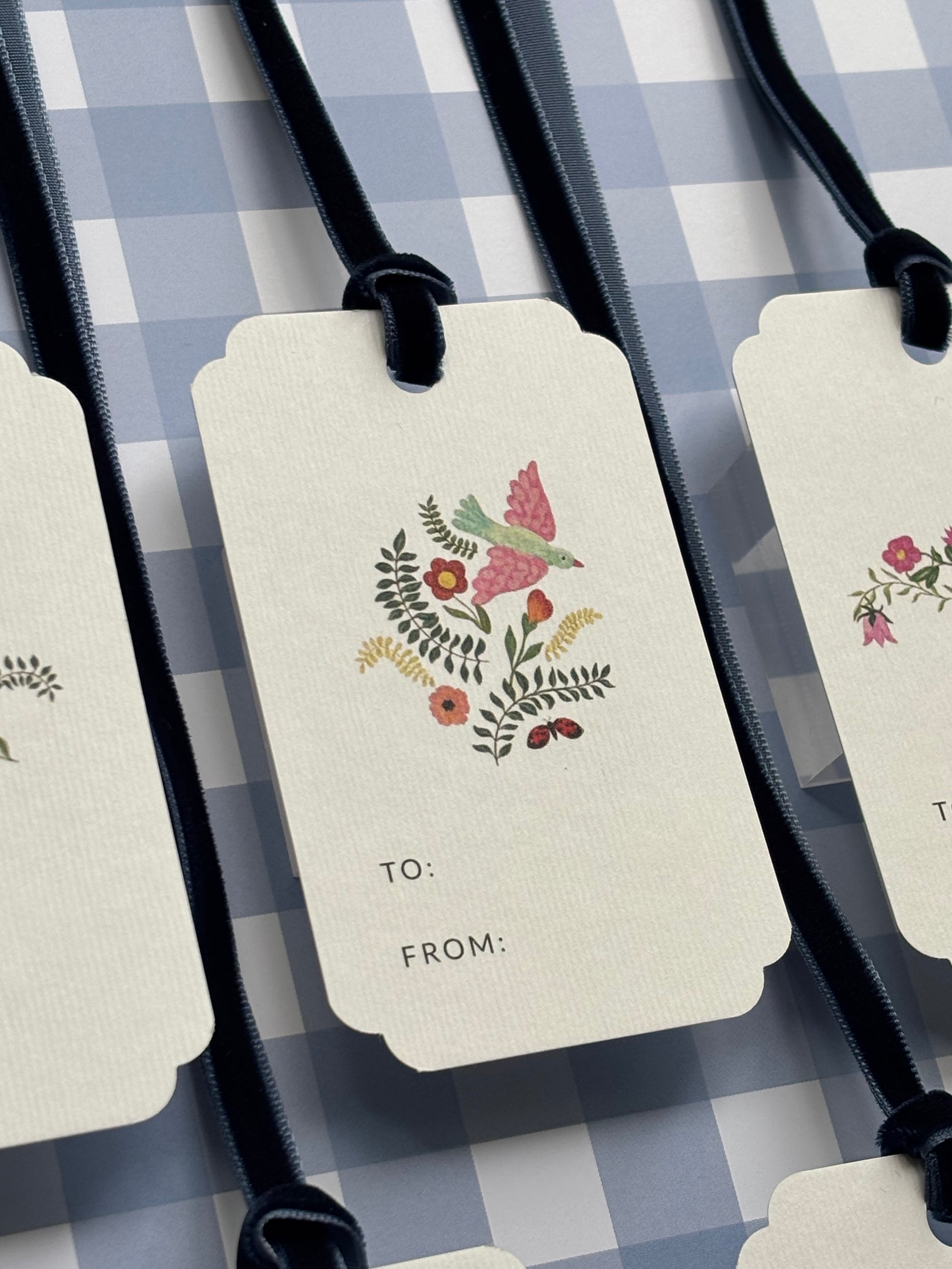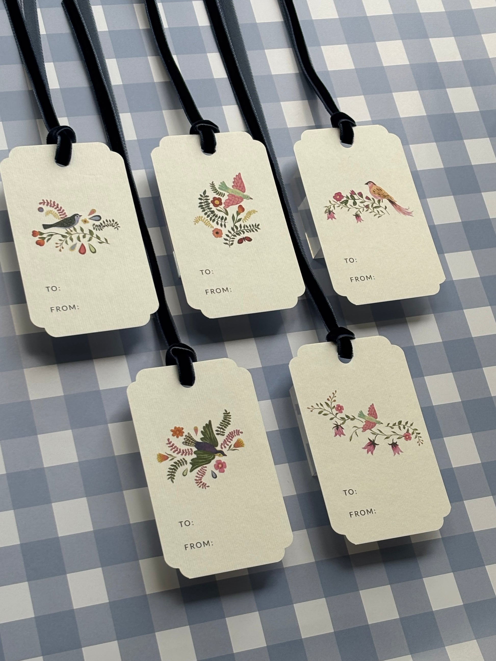 Set di 5 tag illustrati con nastro, stampati in digitale su carta naturale.
